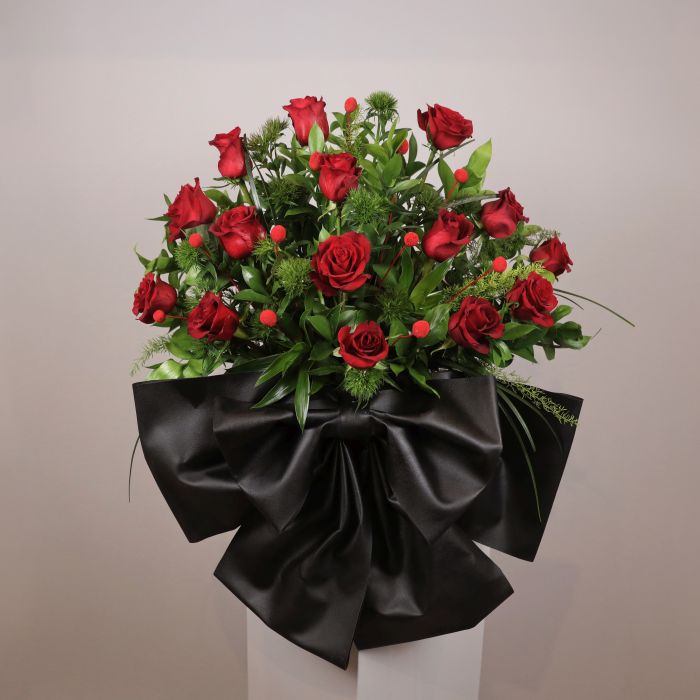 “This very impressive arrangement is part of our new collection – BIG BOWS, BIG LOVE – meant to wow your loved one. A big bow with a big arrangement of red roses and red craspedias complimented with stylish greenery.